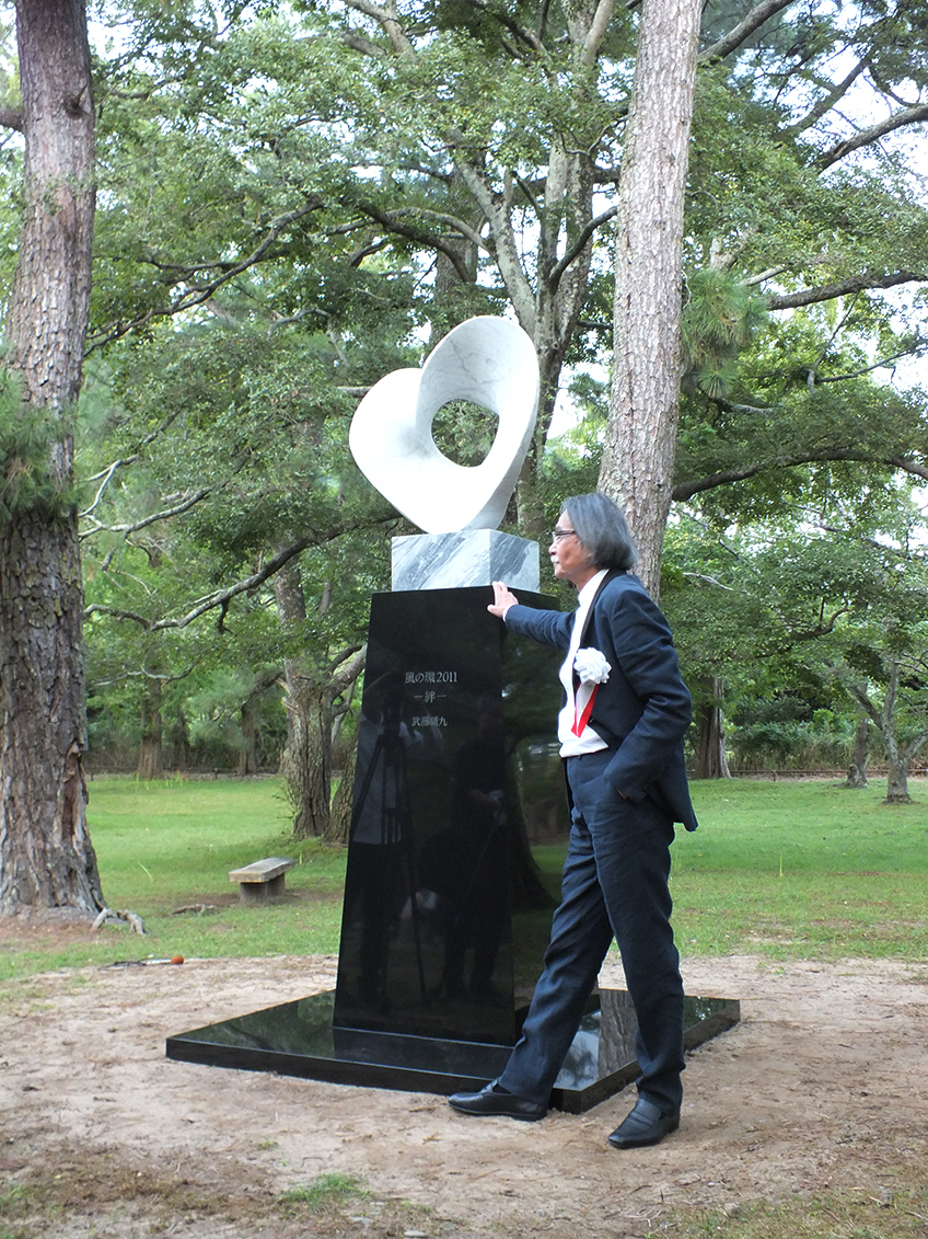 この作品は東日本大震災の慰霊と鎮魂のモニュメント/石巻南浜津波復興祈念公園内の ファーストイメージとして制作されました。 被災地のがれきの中に芽吹く双葉がモチーフとなりました。 自然界の中に在る全ての生命の生と死、そして愛。 この八百万の神々がお集まりになるこの地より、 この作品を通して復興への感謝と共に、 日本民族の「和」の心を 世界の未来へ語り継ぐことが出来ます事を祈念致します。