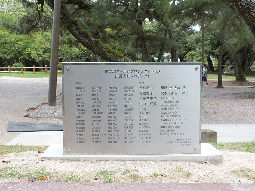 - 出雲大社式典 - 2025.09.19 PM 16:00/ 奉告祭及び除幕式/出雲大社 PM 19:30/レセプション/ホテル一畑 共催:出雲大社プロジェクト実行委員会、一般社団法人風の環/後援:津山市